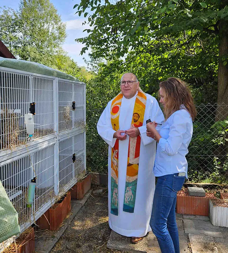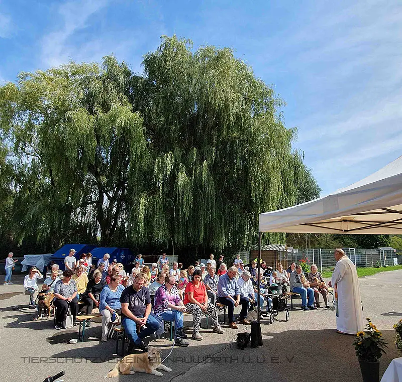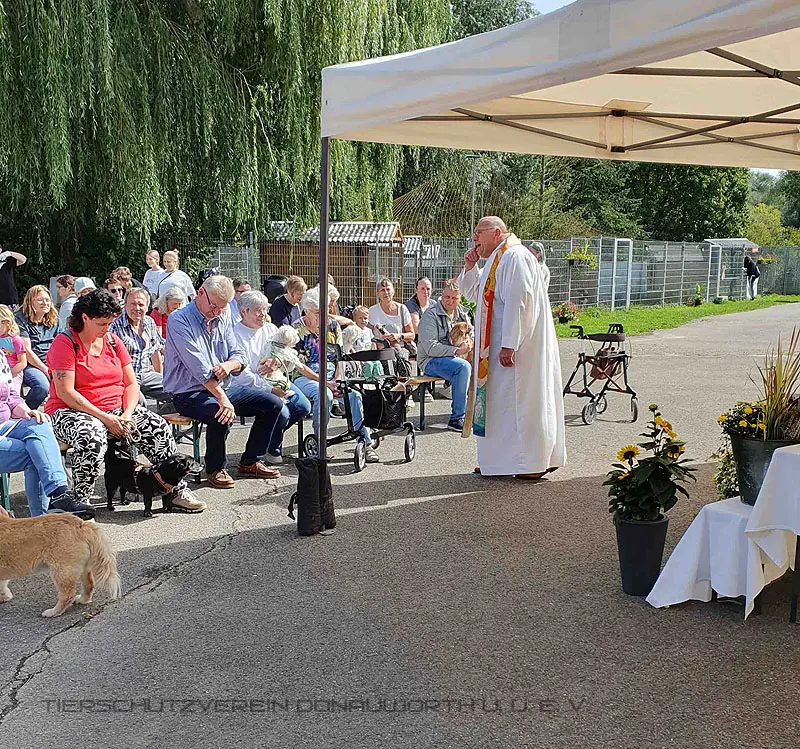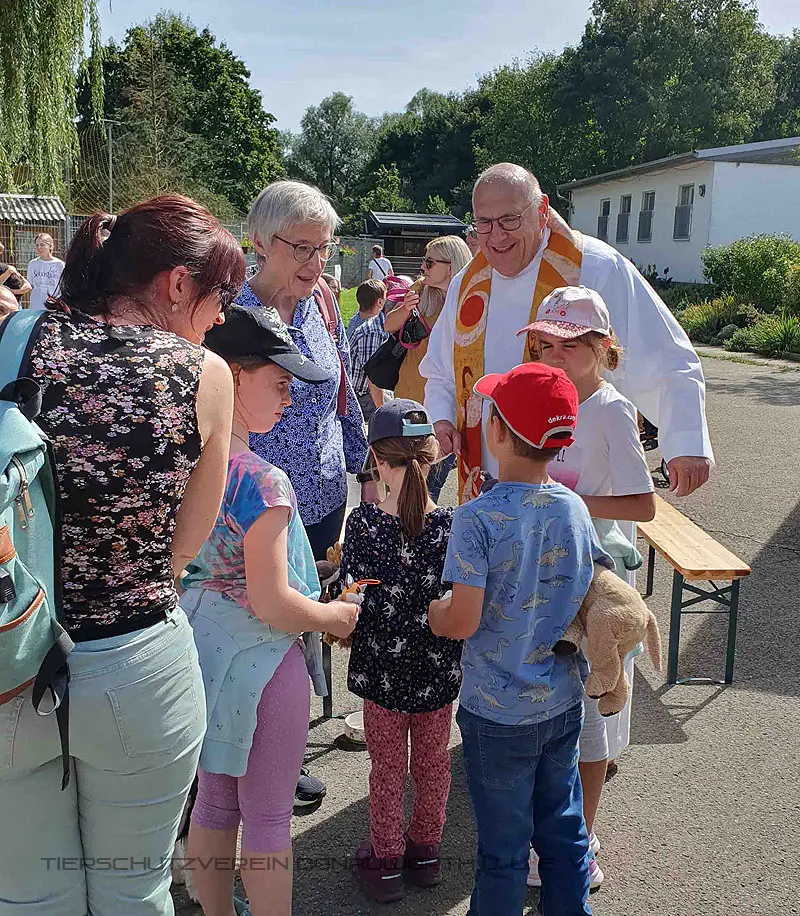 Nach einem kleinen Gottesdienst wurden die teilnehmenden Vierbeiner mit ihren Herrchen und Frauchen gesegnet. Bei einem Rundgang durchs Tierheim auch alle unsere Schützlinge. Auch unser frecher Kakadu Leo erhielt seinen Segen, den er mit einem fröhlichen "Hallo", "Hallo" quitierte.